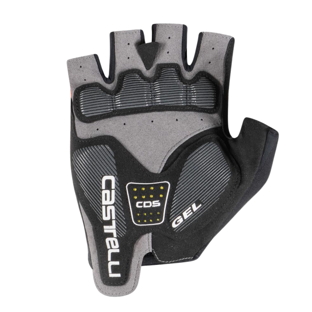 Das im Handflächenbereich integrierte Castelli Dämpfungssystem (CDS) hilft, den Medianusnerv zu schützen und reduziert die Ermüdung der Hand bei langen Ausfahrten. Die Gel-Polsterung kombiniert mit rutschfesten Silikoneinsätzen sorgt für mehr Komfort und sicheren Halt, selbst auf unebenen Straßen.
