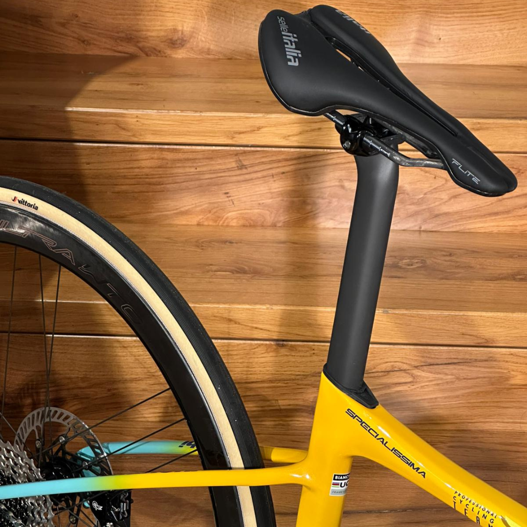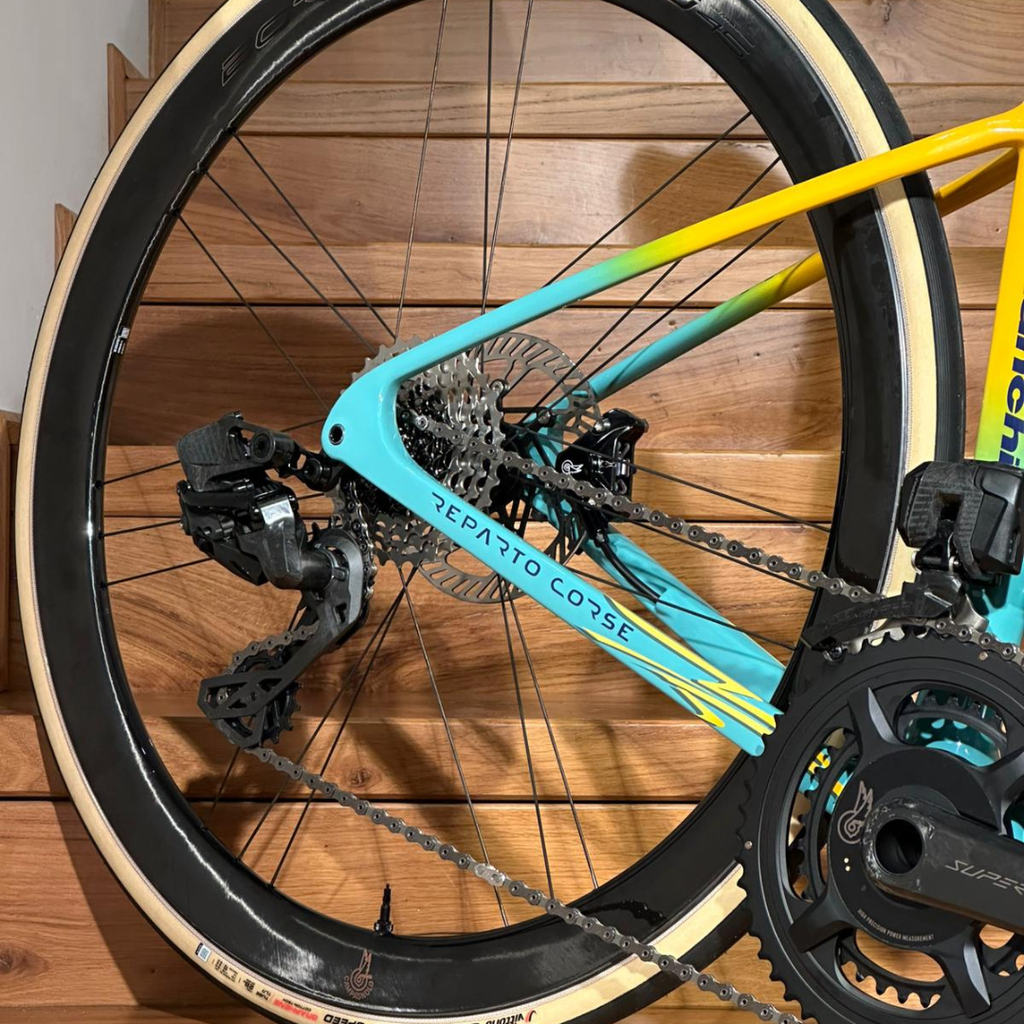 The Bianchi Specialissima RC Pantani with Campagnolo Super Record WRL 13-speed groupset represents the absolute pinnacle of ultralight road bikes. Designed for the most demanding climbers, it combines advanced aerodynamics, impeccable stiffness, and a pure, responsive ride feel.