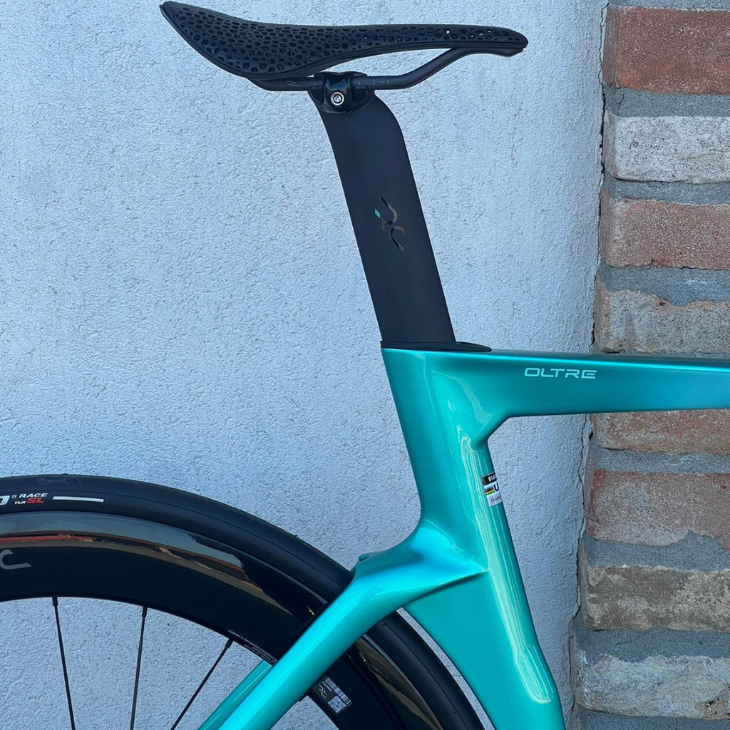 Oltre RC carbon aero shape – predisposto esclusivamente per trasmissione elettronica, passaggio cavi interno, freni a disco flat mount, perno passante 12x142 mm.