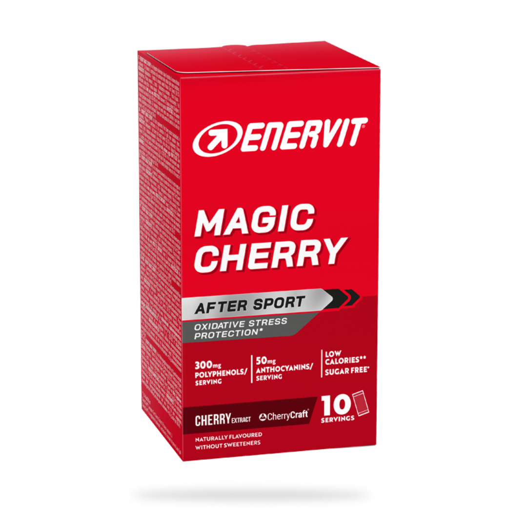 Enervit Magic Cherry is a dietary supplement with antioxidant action, designed to support post-workout recovery and counteract oxidative stress caused by intense efforts. Its exclusive formula is based on Tart Cherry extract (Vistula variety), standardized in polyphenols and anthocyanins, with a very low calorie content and without sugars or sweeteners.