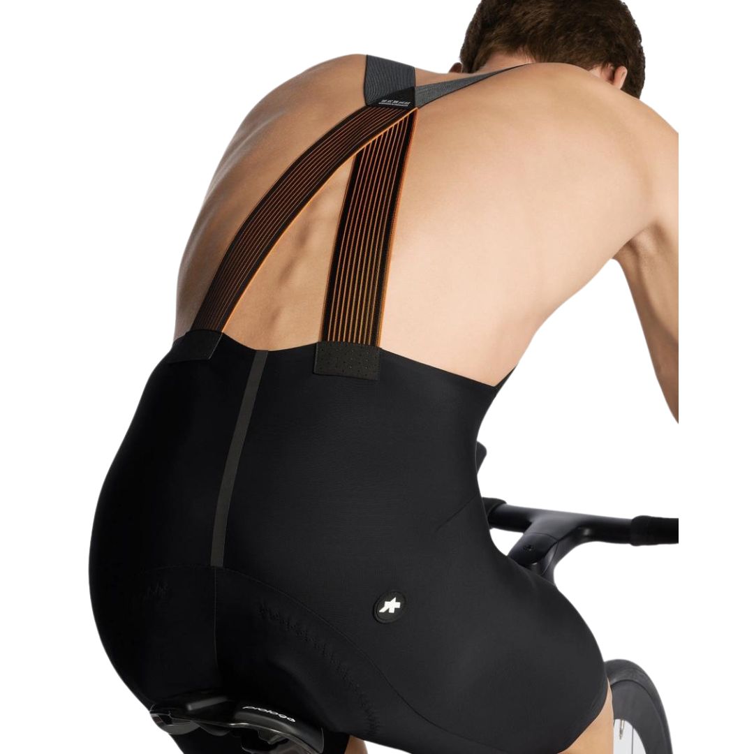 The Assos Equipe RS Schtradivari S11 Long represents the new generation of shorts used in the WorldTour, completely redesigned to offer greater lightness, breathability, and targeted compression. Designed for high-performance cycling, this bib short guarantees enveloping stability from waist to legs, with raw-cut hems and increased leg length of +3 cm (Long Version).
