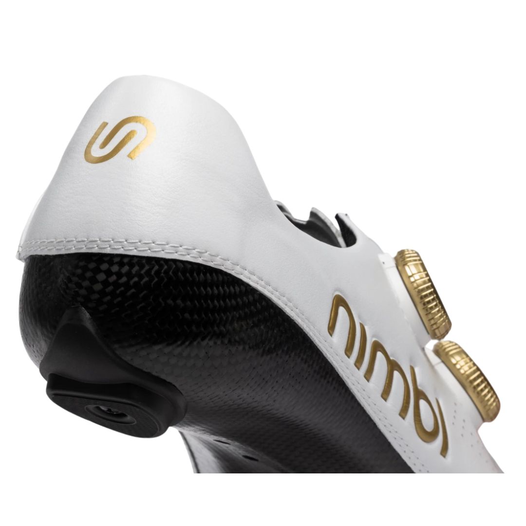 La estructura exhibe elegantemente el carbono trabajado a mano, un distintivo de la producción artesanal Nimbl. Cada zapatilla es una pieza única, pensada para quienes valoran la calidad más allá del rendimiento.