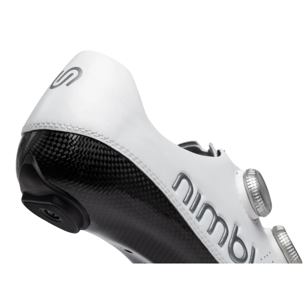 Le châssis met élégamment en valeur le carbone travaillé à la main, une marque distinctive de la production artisanale Nimbl. Chaque chaussure est une pièce unique, conçue pour ceux qui apprécient la qualité au-delà de la performance.