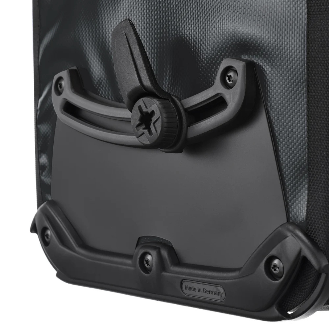 Il sistema di fissaggio QL2.1 consente di agganciare e rimuovere rapidamente le borse dal portapacchi, assicurando al tempo stesso una tenuta stabile e sicura durante la pedalata. Le tracolle incluse permettono un trasporto comodo anche una volta scesi dalla bici.