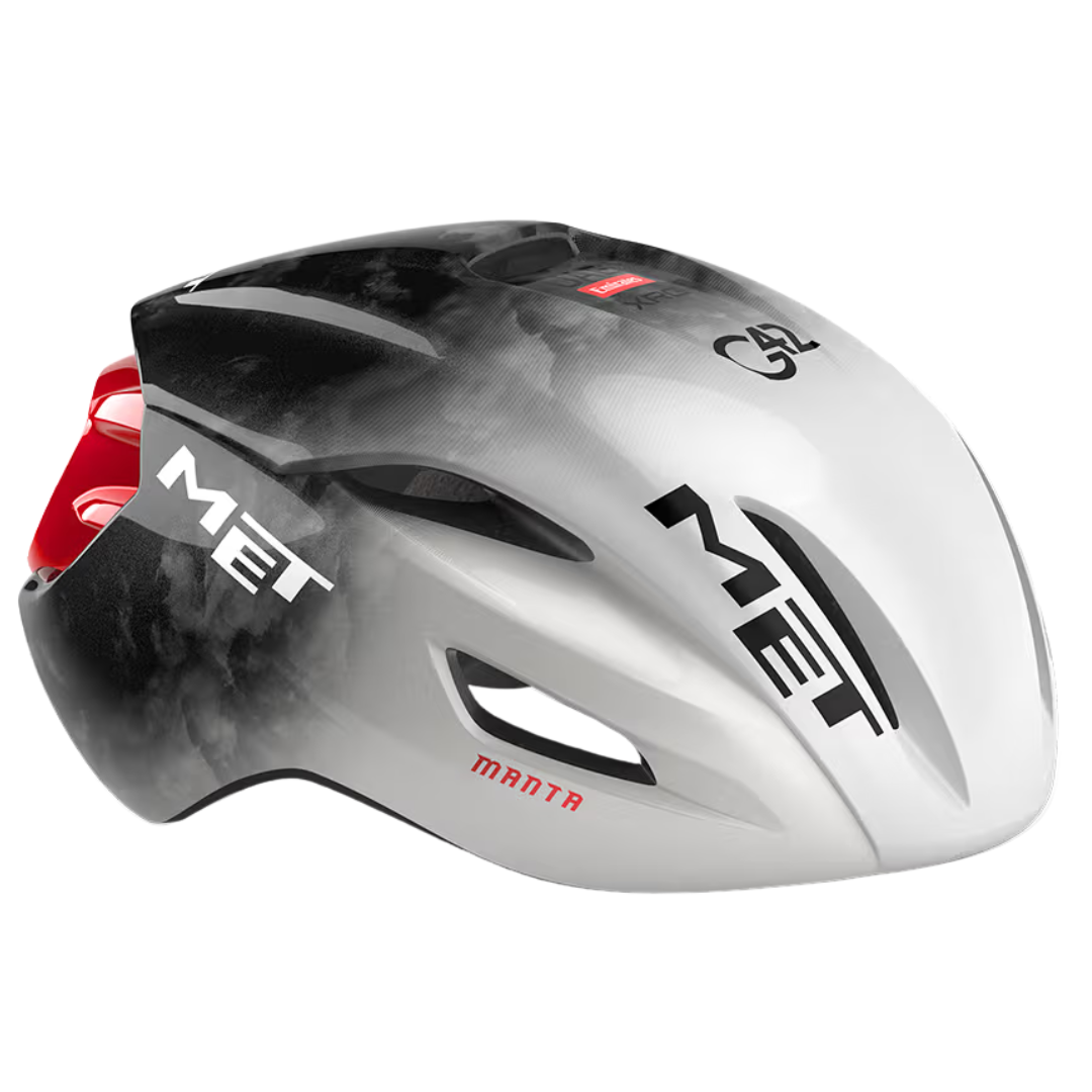 Ispirato direttamente al look ufficiale del UAE Team Emirates, il MET Manta 2025 in versione XRG è una fusione di estetica e tecnologia. L’effetto sfumato tra nero, bianco e rosso metallizzato si combina con un profilo affilato per un casco che non passa inosservato né in gruppo né sul podio.