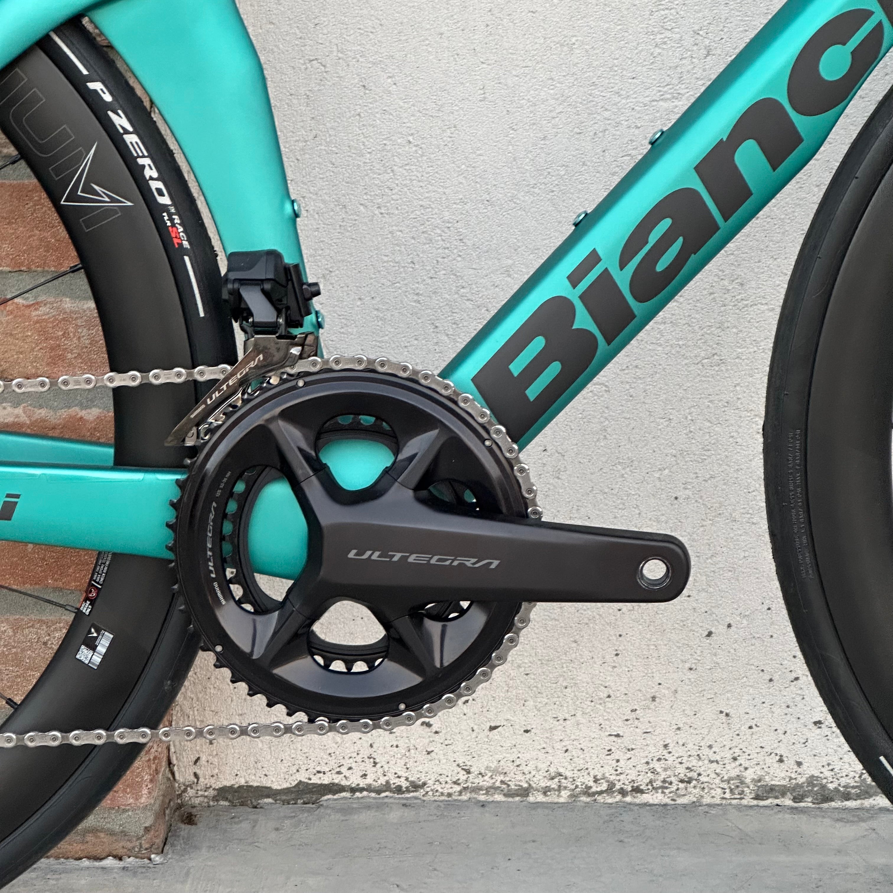 Guarnitura: Shimano Ultegra FC-R8100 con power meter 4iiii Precision 3+, corone 52x36T. Le lunghezze delle pedivelle variano in base alla taglia del telaio (170mm per 47/53 cm, 172.5mm per 55/59 cm).