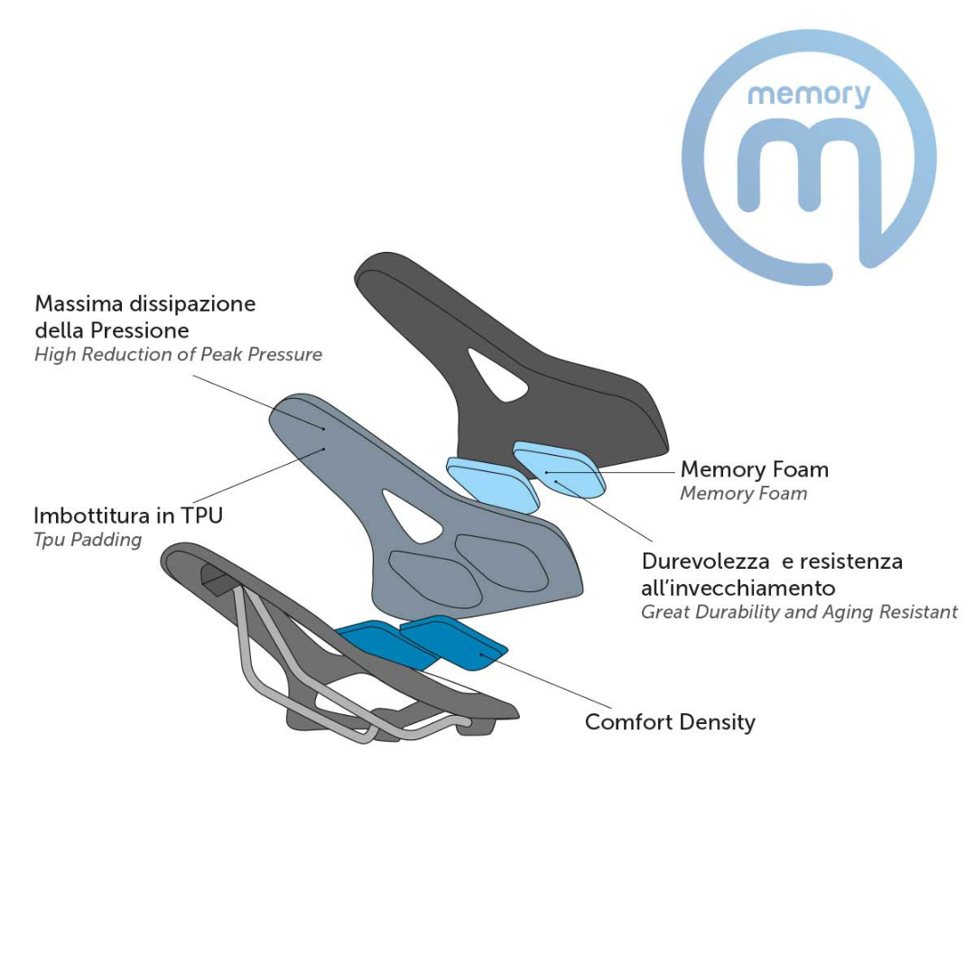 L’imbottitura in Memory Foam utilizza un materiale termosensibile visco-elastico in grado di adattarsi perfettamente alla linea del corpo, mantenendone la forma nel tempo. Questa caratteristica consente una distribuzione uniforme della pressione, riduce la compressione e contribuisce ad alleviare le tensioni muscolari, migliorando sensibilmente il comfort in sella.